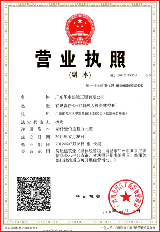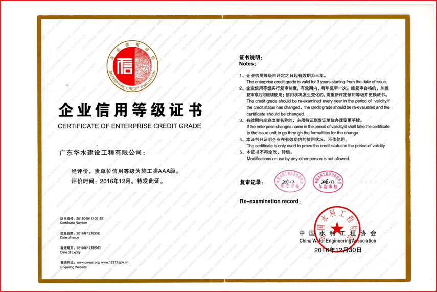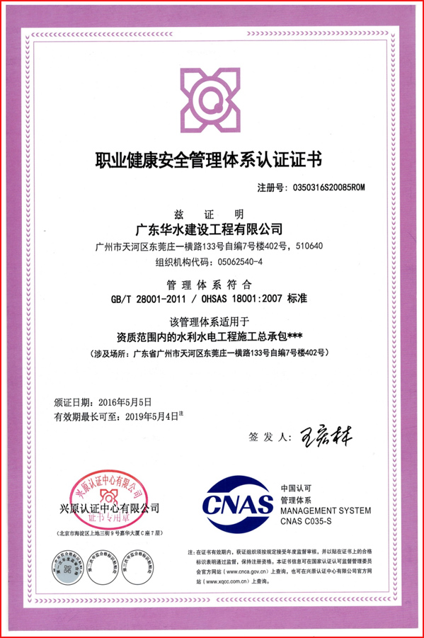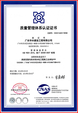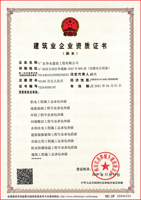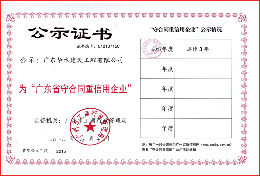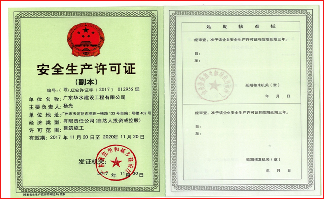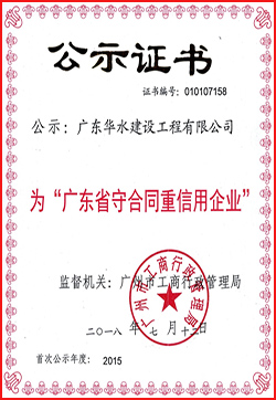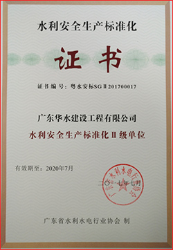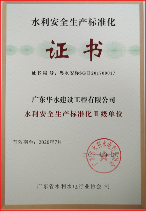 广东华水建设工程有限公司成立于2012年7月26日,现位于广东省广州市天河区华观路1933号万科云城A栋905,注册资金6180万元,资质类别及等级有:水利水电工程施工总承包叁级;市政公用工程施工总承包叁级;建筑工程施工总承包叁级;机电工程施工总承包叁级;建筑装修装饰专业承包贰级;防水防腐保温专业承包贰级;环保工程专业承包叁级;地基基础工程专业承包叁级;河湖整治工程专业承包叁级。荣获“水利部建设市场主体信用施工类AAA级”,“广东省守合同重信用企业”,“2017年度水利工程优秀质量管理一等奖”,“水利安全生产标准化二级单位等”。
